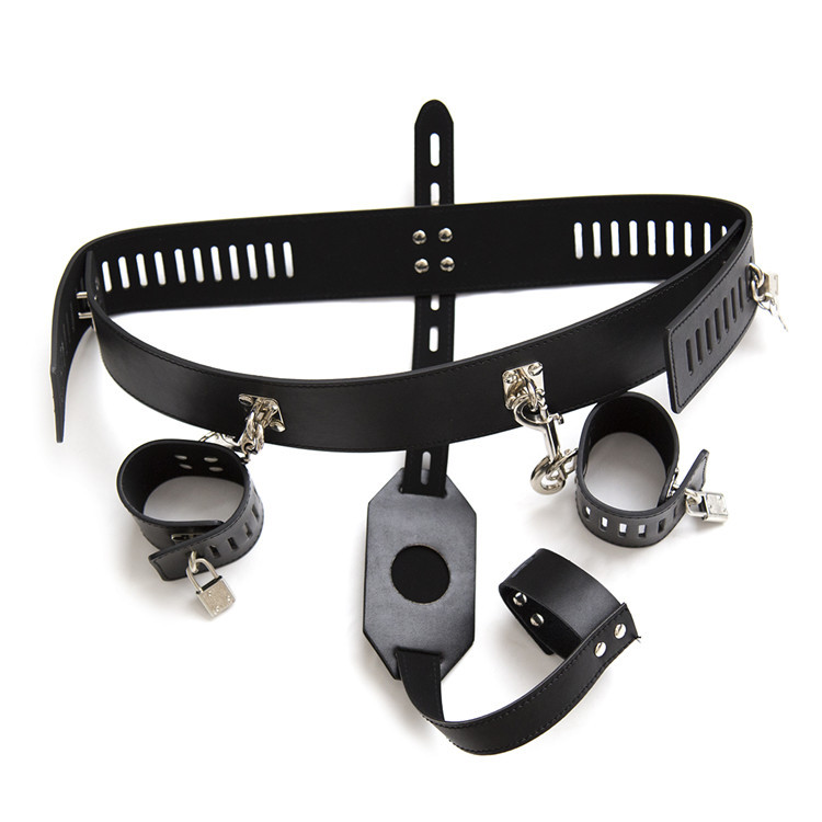 Male Faux Leather Harness Chastity Pants Restraints Bondage Underwear With Penis Cock Ring&Hand Bondage Cuffs