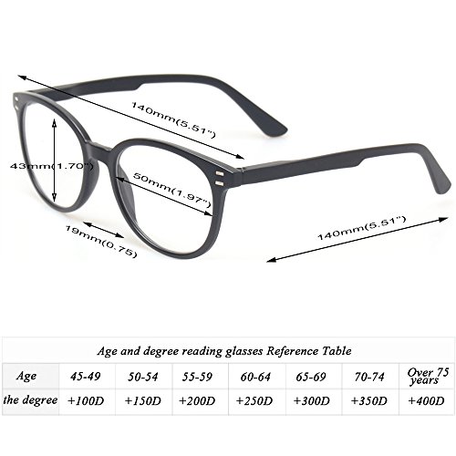 Product Description Specification: Width of the forehead frame :140mm/ 5.51" (approx.) Lens Height:43mm/ 1.7" (approx.) Lens Width : 50mm/ 1.97" (approx.) Leg Length :140mm/5.51" (approx.) Color:Gray Black Red Purple Orange Please specify the frame color and lens strength when pay for this.Thanks! Classic-shaped frames, look good on any face. help glasses fit your face Material : PC Frame, AC Lens,Head Size:Narrow to Medium Diopter available: 100 150 200 250 300 350 400 Other diopter: 125 175 225 275 450 500 600 Note: Due to the difference between different monitors, the picture may not reflect the actual color of the item. Thank you! Size for manual measurement, there may be a 0 to 1 cm error, belongs to the normal phenomenon. Package includes: 5 x Reading Glasses
