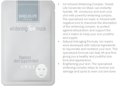 - Ion Infused Whitening Complex: Shield Life Ceramide Ion Mask can instantly hydrate, lift, moisturize and even your skin with powerful whitening complex. The specialized ion mask is infused with negative ions to maximize the absorption of the whitening complex, to protect against dehydration and support the skin's matrix to keep your skin youthful and supple.