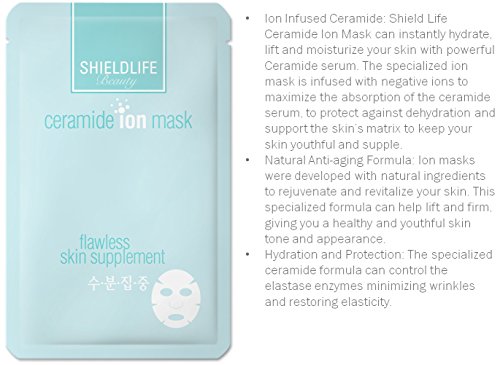 - Ion Infused Ceramide: Shield Life Ceramide Ion Mask can instantly hydrate, lift and moisturize your skin with powerful Ceramide serum. The specialized ion mask is infused with negative ions to maximize the absorption of the ceramide serum, to protect against dehydration and support the skin's matrix to keep your skin youthful and supple.