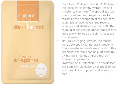 - Ion Infused Collagen: Shield Life Collagen Ion Mask can instantly hydrate, lift and moisturize your skin. The specialized ion mask is infused with negative ions to maximize the absorption of the serum to replenish collagen levels and restore radiance and elasticity. Concurrently, the formula minimizes the appearance of fine lines and wrinkles as the skin processes the collagen.