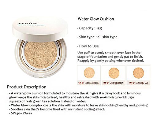 -. Binding : Misc. -. Brand : Innisfree -. EAN : 0642968576892 -. Feature : Innisfree Water Glow Cushion / #23 0.53 Oz/15g / Contains 100% Jeju island Green Tea water instead of water : Makes your skin moist for a log time. / Water Glow Complex elements : Gives rich moisturizing coating effect n makes your skin healthy n sleek like containing water. / Gives you the immediate cooling effect at the moment it touches your skin. -. Label : Amore Pacific -. Manufacturer : Amore Pacific -. MPN : JHICINIWAGLOCUS23 -. PartNumber : JHICINIWAGLOCUS23 -. ProductGroup : Beauty -. ProductTypeName : BEAUTY -. Publisher : Amore Pacific -. Studio : Amore Pacific -. Title : Innisfree Water Glow Cushion #23 0.53 Oz/15g -. UPC : 642968576892