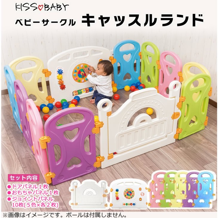 | 30度刻みで角度調節が出来るジョイントで、お部屋の形や使いたい大きさにアレンジできるベビーサークルです。おもちゃパネルはお子様が夢中になる機能がいっぱい!!扉パネルは外からロックが掛けられます。 |