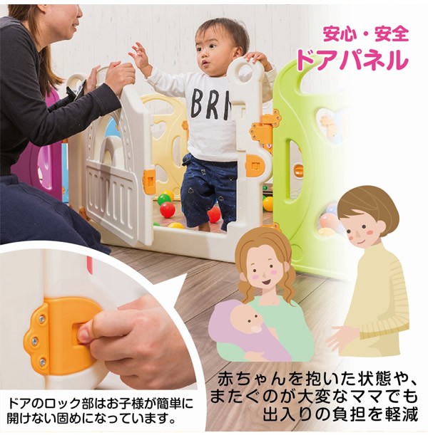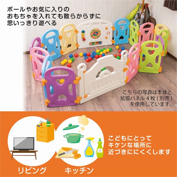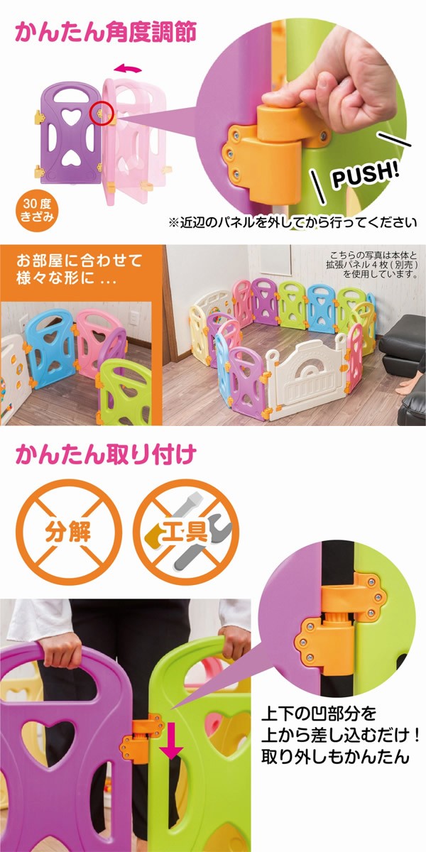 30度刻みで角度調節が出来るジョイントで、お部屋の形や使いたい大きさにアレンジできるベビーサークルです。おもちゃパネルはお子様が夢中になる機能がいっぱい!!扉パネルは外からロックが掛けられます。 |