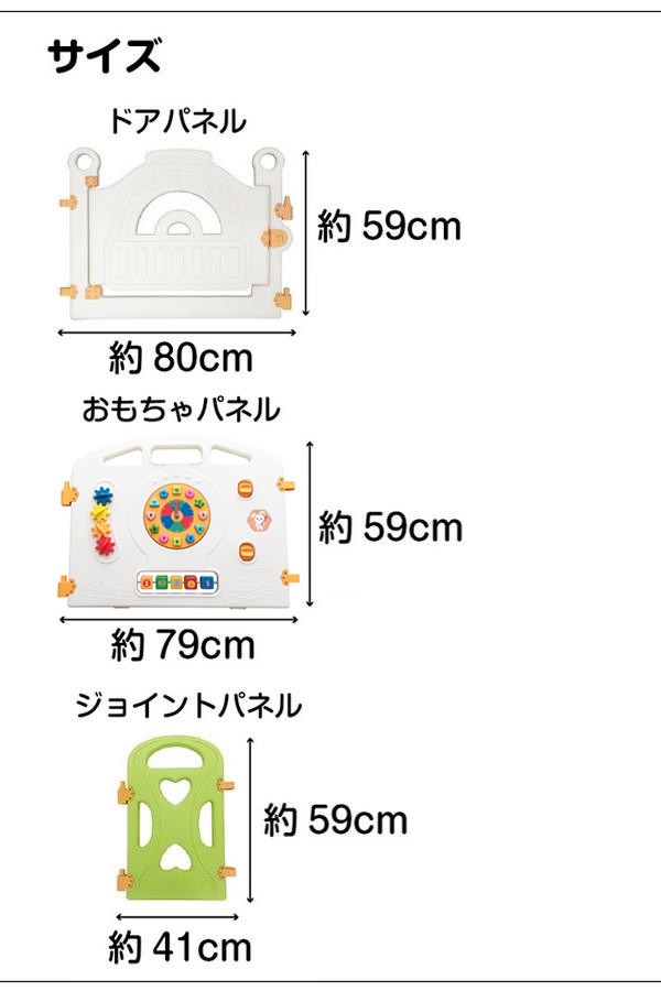 | セット内容 | ドアパネル1枚、おもちゃパネル1枚、ジョイントパネル10枚(5色×各2枚)、取扱説明書兼保証書(保証期間:6ヶ月) |