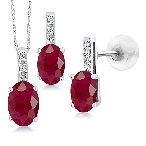 -. Binding : Jewelry -. Brand : Gem Stone King -. Color : Red and White -. Department : womens -. Feature : SIMPLY SOPHISTICATED - This delicate pendant will immediately put you in the spot light. Crafted with high quality stones this pendant is the perfect accessory for any ensemble on any occasion. Our complimentary 18" Chain makes sure that this piece is stunning and all around flattering. / UNIQUELY DESIGNED- With simplicity in mind this pendant is the perfect item for gift givers who want to show they care. Perfect for birthdays, weddings, mother day or just those moments when you want to get something for that "Someone Special". / GORGEOUS- and Sparkly these unique earrings are perfect for any outfit! Pair them with date night and work week looks you cannot go wrong! Beautifully crafted these earrings are the perfect gift for any occasion and make perfect stocking stuffers for the holidays. They're truly a fashion staple and belong in every jewelry collection / UNIQUE- The design of these earrings will ensure that you stand out effortlessly. Gift these beautiful earrings to yourself or someone you love. Made in the USA Gem Stone King products are always made with the highest quality elements and standards / Gemstones may have been treated to improve their appearance or durability and may require special care. -. Model : IJM-0204-OV-R-R-R-R-DI-W-WG14K -. NumberOfItems : 1 -. PackageQuantity : 1 -. ProductGroup : Jewelry -. ProductTypeName : FINENECKLACEBRACELETANKLET -. Title : 2.29 Ct Oval Red Ruby and Diamond White Gold Pendant Earrings Set