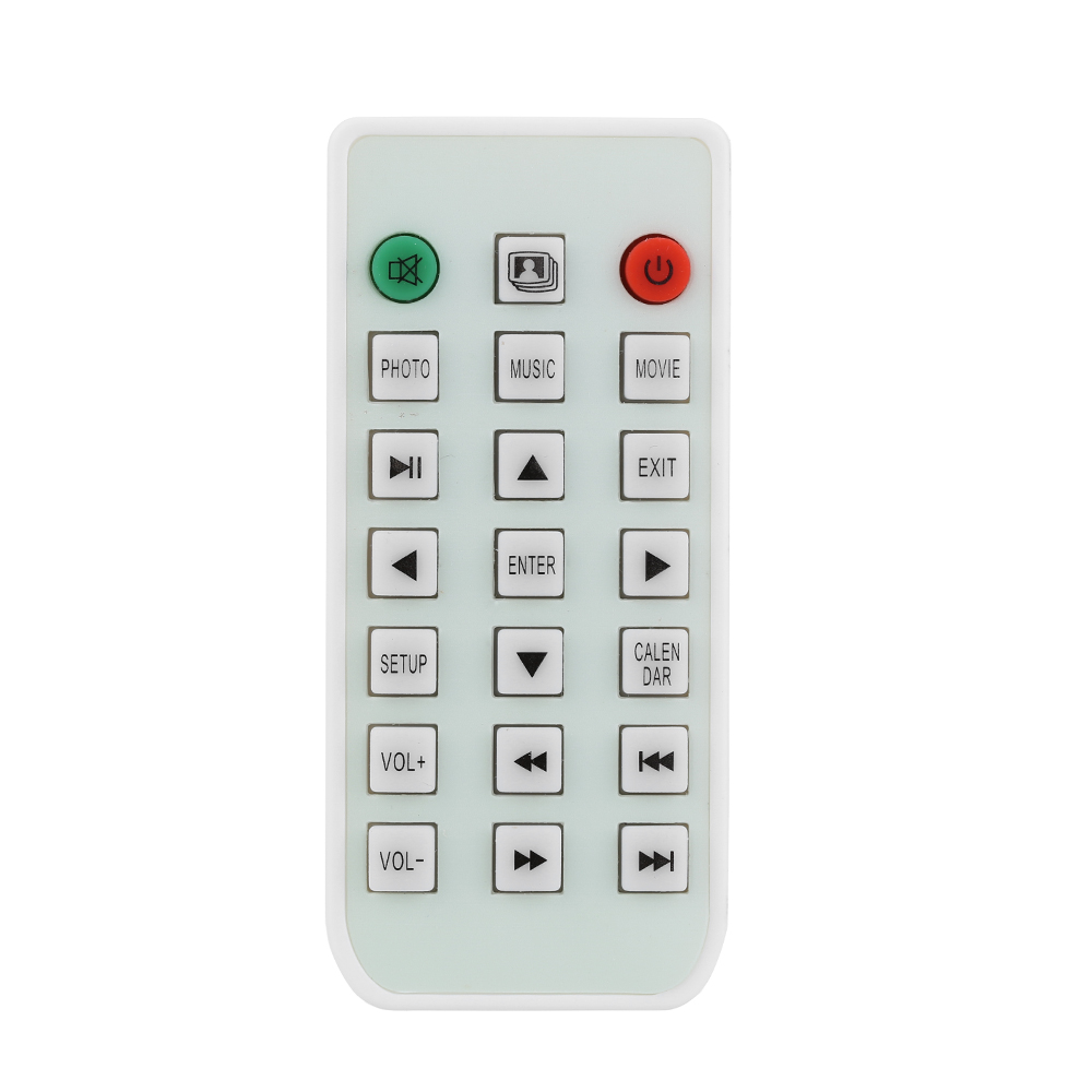 A compact IR remote control (battery not included) for convenient access to playback controls.