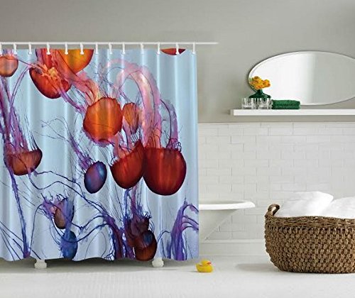Orange Shower Curtain Sea Animals Contemporary Nautical Abstract Artwork Decor by Ambesonne, Colorful Jellyfish in the Ocean Seaside Waterdrop Modern Bathroom, 69x70 Inches Long Orange Purple Blue