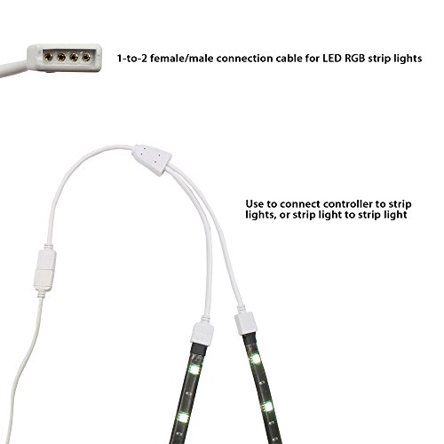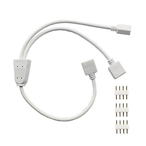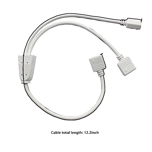 This is 1 to 2 splitter for 5050/3528 RGB LED strip lights. No matter you are professional or not, this component will help you to finish your project quick and easy. It can be used as strip to strip or strip to controller connection cable and save you plenty of time on soldering electric cables. Simple splitter: This splitter is very easy to connect up to 2 LED strip lights, match the arrows on strip light connectors Width and length: 10mm width and 12.2 inch length compatible with LED RGB strip lights and controller totally All-round curving: Angle free twistable connector, extend or bend the LED strip light around the corner Plug and play: easy to use, no need soldering wire or cables Tool-free installation: This 1 to 2 ports female connector cable 4-pin splitter is great for flexible LED Strip light, it will save you a great deal of time and effort during installation project. Specification Weight: 0.8 ounces Length: 12.2 inch Voltage: 12V Color: white Jacket material: PVC Application Use to connect controller to strip lights, or strip light to strip light Package Include 1*1 to 2 ports splitters cable 3*4-pin male connector with free