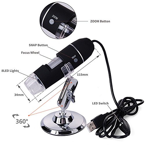 -. Feature : USB-powered handheld digital microscope .Focus Range: from 0mm to 200mm. Frame Rate: Max 30f/s under 600 Lus Brightness. Magnification Ratio: 20x to 800x / It has 8 built-in LED lights on camera head to illuminate the inspection area,the LED lights' brightness is adjustable (a wheel on the cable). / Automatic Light Contrast And Fine Focus,displays The Magnified Image On Computer Screen,Can Be Used In Inspection Such As Skin, Hair, Education, Collection, Industrial, And Biological / HD Color CMOS Sensor, High Speed DSP,Contains Digital Measurement Software And Calibration Contains An Adjustable Metal Stand / The microscope is made up of high-quality IC and electronic components, with clear image quality, low power consumption, high-resolution, applies to small objects to be larger photo and video production, it is the best choice of small objects recognization