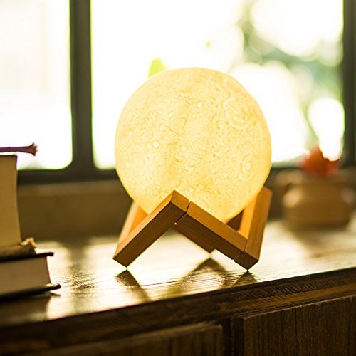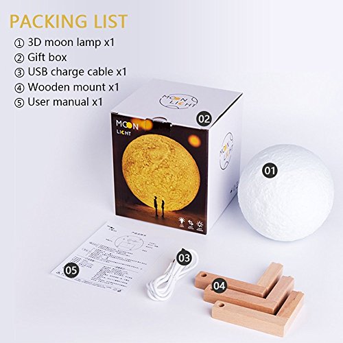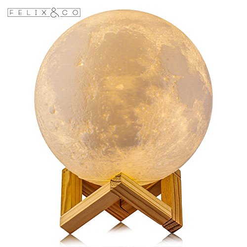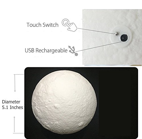 -. Feature : •REALISTIC - Using some of the most advanced 3D printing technology, this realistic moon lamp has been created using NASA's own satellite data source. Have your own private moonlight in the comfort of your bedroom or living room. Perfect for romantic dinners, children's play rooms or as use as a nightlight for yourself or young child. / •CREATED FOR COMFORT - Boasting environmentally friendly PLA material, this 5.1 inch/13cm moon lamp creates beautiful lighting which can be adjusted to suit any mood. The portable design is perfect for any situation with a total charge time of 4-12 hours depending on brightness. / •EASY-TO-USE - Switch easily between the 3 different settings (White, Warm White or Yellow) by simply tapping the touch sensor located on the bottom of the lamp or tap and hold to adjust brightness. / •USB-RECHARGEABLE - Included in the box is a USB charging cord for simple plug and charge operation. The device operates on a low voltage energy efficient LED light bulb which will stay cool even through long hours of use. Total charge time 2-3 hours. / •EXCEPTIONAL SERVICE - Felix&Co strives to offer quality customer service for all, if there any absolutely any problems with your purchase please let us know and we will offer a 100% refund.