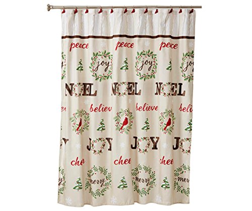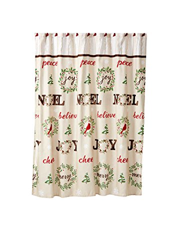 The shower curtain features a Christmas wreath design along with the words Peace, Joy, Noel, Believe, Merry, and Cheer. There is also a barn wood style header at the top.