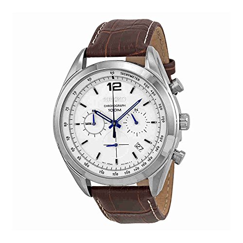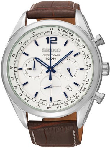-. Title : Seiko Chronograph White Dial Stainless Steel Brown Leather Mens Watch SSB095