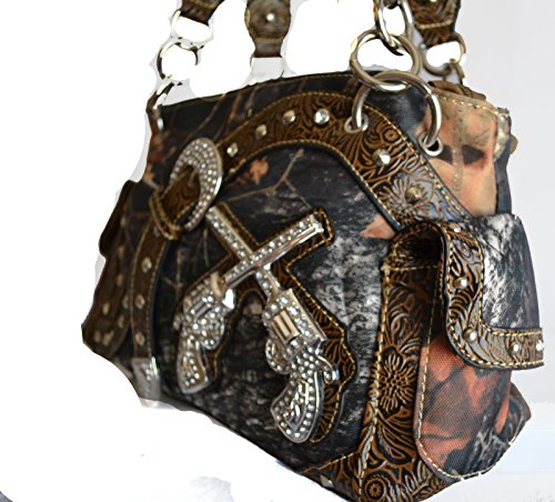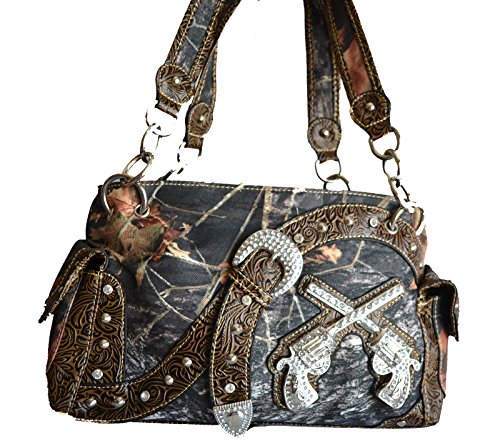 Product DescriptionGear up for the season in style with this fashionable rhinestone-studded canvas body Mossy Oak print tote. Clear rhinestone gun accent on front.0