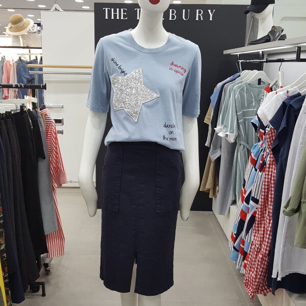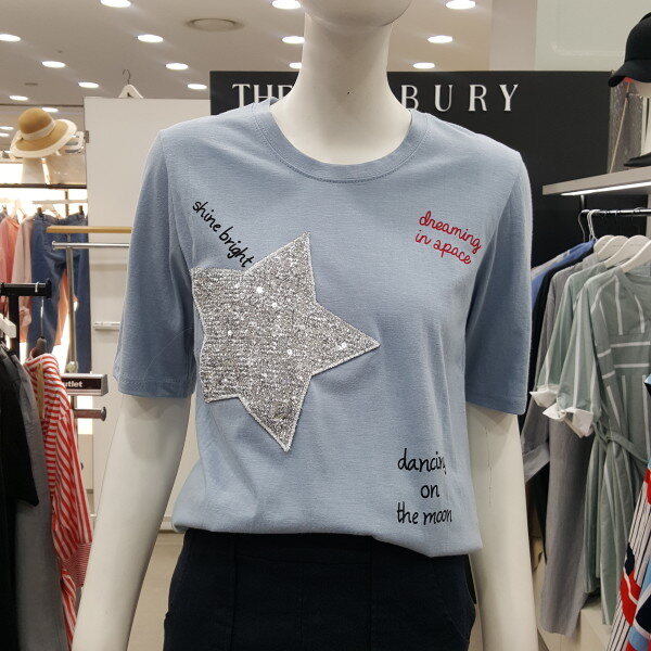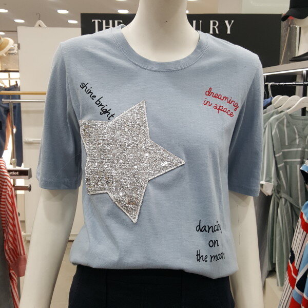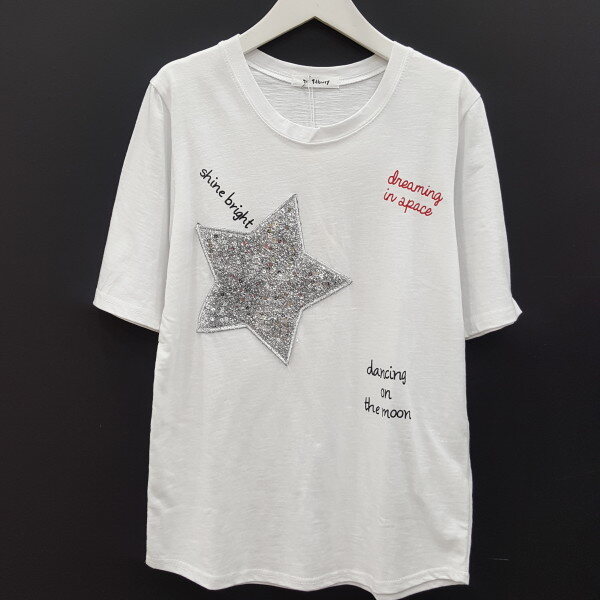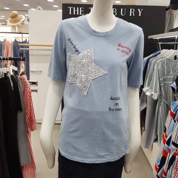 시원한 면100%소재의 여름 데일리 티셔츠로 제격입니다 앞쪽의 실버별이 포인트로 다양한 스타일에 코디 연출 가능합니다프리사이즈 총길이68