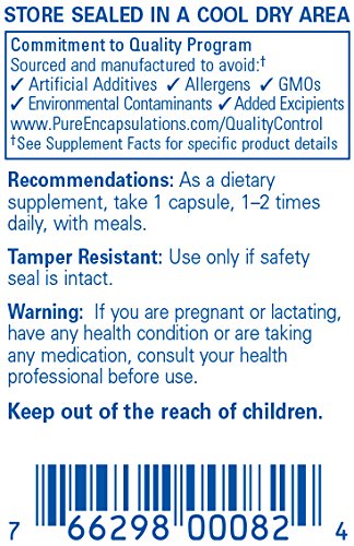 FREE FROM: Pure Encapsulations products are free from wheat, gluten, egg, peanuts, magnesium stearate, hydrogenated fat, artificial sweeteners and colors, and other unnecessary excipients. Any product containing ingredients derived from allergens, such as soy, dairy or shellfish is clearly labeled. * These statements have not been evaluated by the Food and Drug Administration. This product is not intended to diagnose, treat, cure, or prevent any disease.