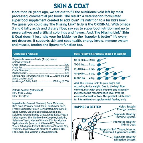 Fur kiddo's coat looking a little dull? Four-legged friend itching like crazy? Add a daily helping of The Missing Link ORIGINAL Superfood Skin & Coat formula and let the "good hair days" roll! Chock full of not only balanced Omega 3 and 6 fatty acids, but phytonutrients and dietary fibers too, this power packed superfood supplement goes to work on helping your fur kiddo be healthy both inside and out. We'd say that's a pretty potent spoonful.