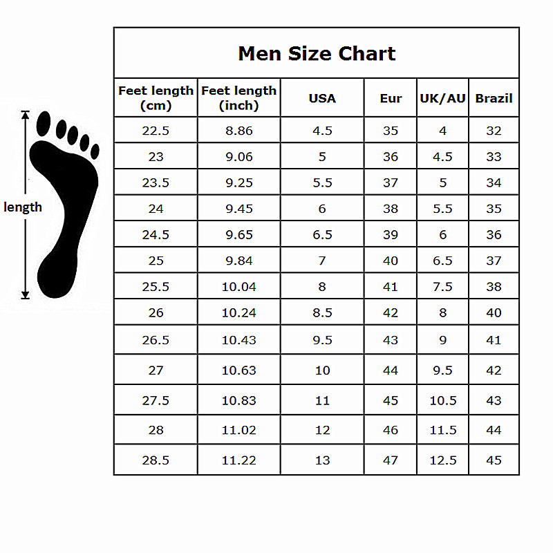 Feet length (cm) Feet length (inch) USA Eur UK/AU Brazil