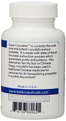 ReleaseDate : 2014-08-20 Studio : Balanceuticals Publisher : Balanceuticals Binding : Health and Beauty Product Description Super Corydalis is the most pure and potent corydalis extract available today. The formula is made with a state of the art 4:1 hot water extraction process, meaning 4 ounce of the herb is needed to make 1 ounce of the extract. The hot water extraction method guarantees purity and potency. Corydalis is also known as Yan Hu Suo or Chinese Poppy and has been used in Traditional Chinese Medicine for Centuries for its tranquilizing properties to soothe discomfort. 0