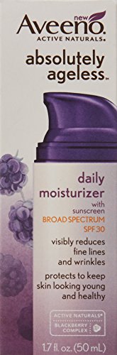 Create a healthy foundation for younger-looking skin by moisturizing daily with Aveeno Absolutely Ageless Daily Moisturizer with Broad Spectrum SPF 30 Sunscreen. This formula visibly reduces fine lines and wrinkles and helps protect to keep skin looking young and healthy. Absolutely Ageless Daily Moisturizer helps reduce the visible effects of elastin and collagen loss, but also nourishes skin, to keep it looking younger, longer. This anti-aging moisturizer contains Active Naturals Blackberry Complex infused with vitamins C and E, antioxidants, and powerful anti-aging ingredients. The dermatologist-tested and hypoallergenic formula is non-greasy and won't clog pores.Feature