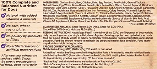 Rachael Ray Nutrish Beef Stroganwoof Recipe is made with tasty, tender beef morsels plus wholesome green beans, tomatoes and pasta, all simmered in a delectable and hearty beef gravyAdult Dogs: Feed 1-1/4 container (8.0 oz. 227g) per 10 pounds of body weight daily depending upon your dog's activity level.Feature