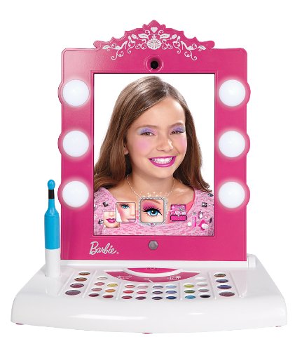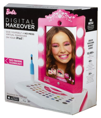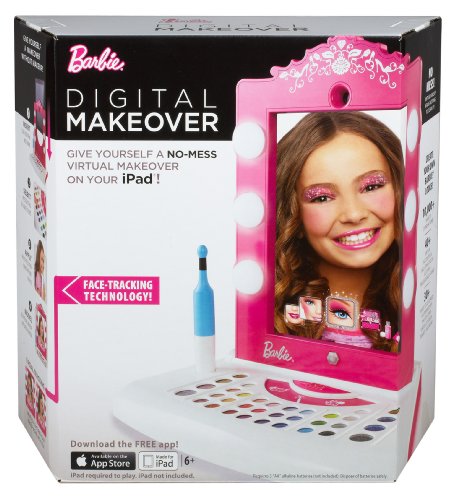 Barbie Digital Makeover Mirror Barbie Digital Makeover Mirror: Enjoy a fabulous, makeup-free makeover with the Barbie Makeover Mirror. Transform an iPad into a digital mirror by sliding it into the vanity frame. Girls can then look into the mirror and select options like eye shadow, lipstick, color, and glitter. Use the included applicator to apply virtual makeup to the girl's live image on the iPad screen!? Facial tracking technology keeps the digital makeup in place as the girl moves, just like she's really wearing it!? Girls can make a digital scrapbook of their favorite makeover looks. Product Features Enjoy a make-up free makeover with the Barbie Digital Makeover! Transform an iPad into a digital mirror by sliding it into the vanity frame Simply look into the mirror and select options like eye shadow, lipstick, color, and glitter Facial tracking technology keeps the digital makeup in place as the girl moves, just like she's really wearing it Girls can make a digital scrapbook of their favorite makeover looks Product Measures: 12" x 2.38" x 12.75" Recommended Ages: 3-8 yearsFeature