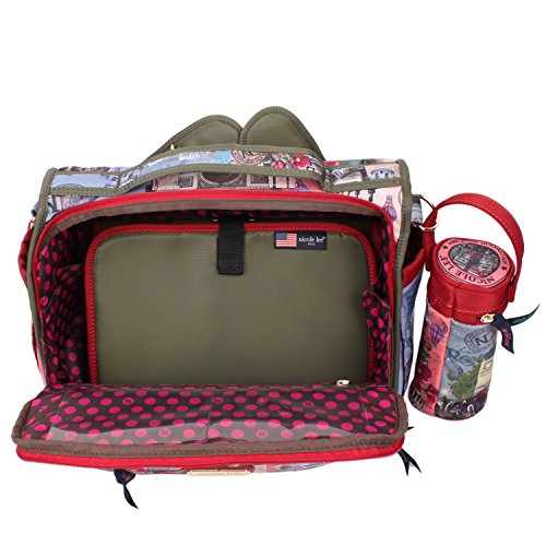 Exterior Features: Made of nylon, Nicole Lee USA exlcusive print on front and back, 2 open side pockets, 2 front zipper pockets , adjustable backpack and shoulder strap, bottle holder, top handle, zipper closures and Nicole Lee USA namplate on front.