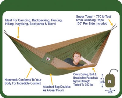 - Feature : Spacious and roomy that you and a friend can relax in most any position / 80" by 118" which is 6 foot 8 inch wide by 9 foot 10 inch long / Conforms to your body so there are no pressure points or irritating rope marks / Fits into a 7.5 inch by 5 inch stuff sack / Weighs only 22 ounces and is strength tested to 350 pounds