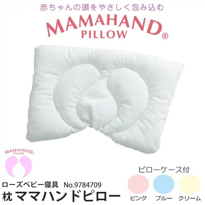 | 赤ちゃんの頭をやさしく包み込むママハンドキルティングが施されたまくらです。ピローケースは3色から選べます。 |