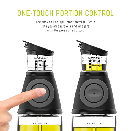 PRECISE MEASURING - Glass oil dispenser bottle for kitchen with teaspoon, tablespoon and milliliter labels for precisely mixing olive oil and vinegar