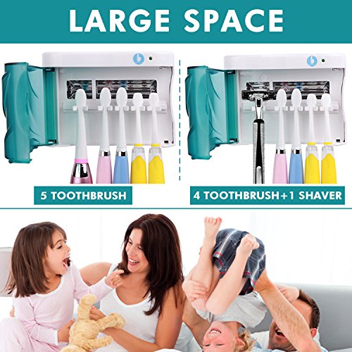 - LARGE CAPACITY: The uv toothbrush sanitizer can store up to 5 toothbrushes, or 4 toothbrushes and 1 shaver. Also disinfects make up brushes, tweezers, nail clippers, dental tools, earrings & more accessories.