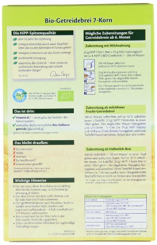 Der Bio-Getreidebrei 7-Korn von Hipp enthält das für die Funktion des Nervensystems wichtige Vitamin B1 sowie wertvolles, leicht verdauliches Bio-Vollkorngetreide. Nicht enthalten sind dagegen Zuckerzusätze, Milch, Aromen, Farbstoffzusätze und Konservierungsstoffe.Feature