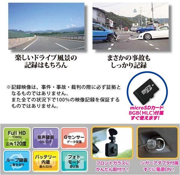 | セット内容 | ドライブレコーダー本体 microSDカード(8GB) 取付ブラケット シガーソケット用電源アダプター USBケーブル ステッカー(車外貼付用)1枚 取扱説明書 保証書(保証期間1年) |