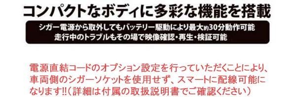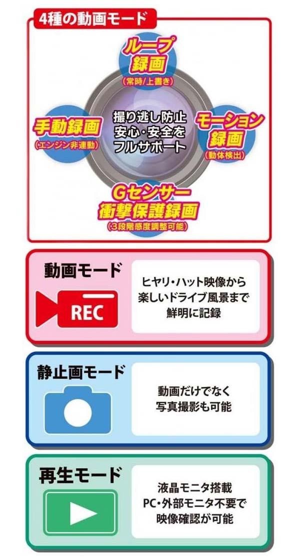 | エンジンスタートで録画開始。重要な瞬間を見逃さない!12V/24V車の両方に対応しています。楽しいドライブの風景の記録はもちろん、まさかの事故もしっかり記録します。またコンパクトなボディに多彩な機能を搭載しています。 |