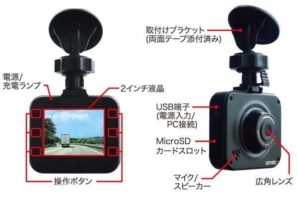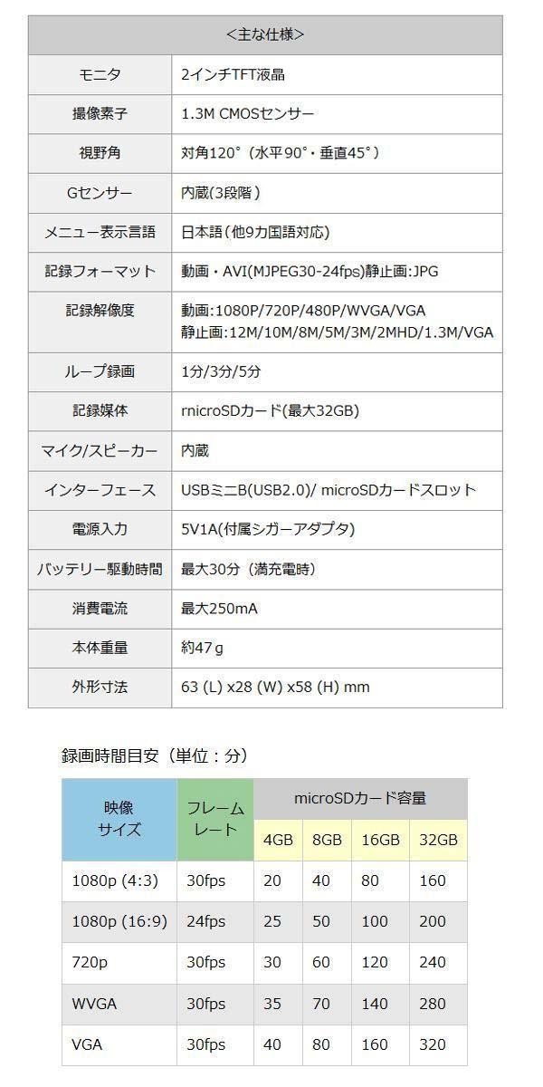 | 仕様 | モニタ:2インチTFT液晶 撮像素子:1.3M CMOSセンサー 視野角:対角120度(水平:90度・垂直45度) Gセンサー:内蔵(3段階) メニュー表示言語:日本語(他9カ国語対応) 記録フォーマット/動画・AVI(MJPEG30-24fps)、静止画:JPG 記録解像度/動画:1080P・720P・480P・WVGA・VGA、静止画:12M・10M・8M・5M・3M・2MHD・1.3M・VGA ループ録画:1分・3分・5分 記録媒体:microSDカード(最大32GB) マイク・スピーカー:内蔵 インターフェース:USBミニB(USB2.0)・microSDカードスロット 電源入力:5V1A(付属シガーアダプタ) バッテリー駆動時間:最大約30分(満充電時) 消費電流:最大250mA |