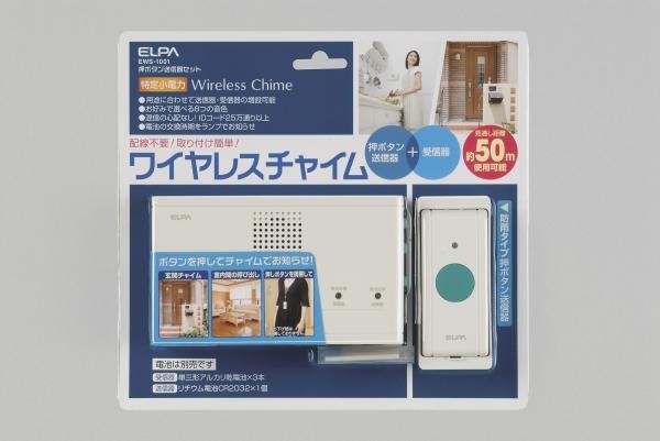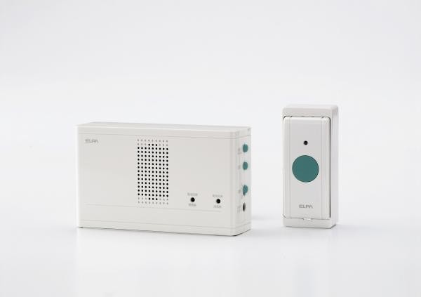 受信器+押ボタン送信器セット配線のいらないワイヤレスチャイム報知連絡を8種類の音でお知らせする受信機と、お部屋からの呼び出しに便利な押ボタン送信器がセットになりましたサイズ本体:4×13.7×8.1cm、押しボタン:2.8×4.1×9.5cm個装サイズ:23×21.2×4.2cm重量172g個装重量:260g素材・材質(受信器)ABS、(送信器)PC付属品取扱説明書、保証書(保証期間1年) 取付ネジ3本、両面テープ1枚製造国中国配線不要!取り付け簡単! 「受信機」使用電池:単三形乾電池×3本(別売) ACアダプター使用可(別売)※当社型番 ACD-045、電池寿命:約1年(1日に10回使用した場合)、音量:約70dB/50cm、電池到達距離:約50m(見通しがよい場合)、周波数:313.625MHz(特定小電力機器)、IDコード:25万通り以上、使用温度範囲:0度C~40度C「送信機」使用電池:コイン形リチウム電池 CR2032×1個(別売)、電池寿命:約2年(1日に10回使用した場合)、電池到達距離:約50m(見通しがよい場合)、周波数:313.625MHz(特定小電力機器)、IDコード:25万通り以上、使用温度範囲:0度C~40度C、耐水性能:IP44 防雨形 受信器+押ボタン送信器セット配線のいら