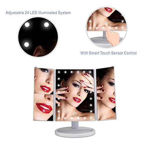Idefair(TM) Lighted Vanity Makeup Mirror,24 LED Light Tri-Fold Makeup Mirror with 10X Cosmetic Spot Mirror, 3X 2X 1X Magnification Touch Screen Control 180 Degree Rotation Adjustable Stand Desk USB