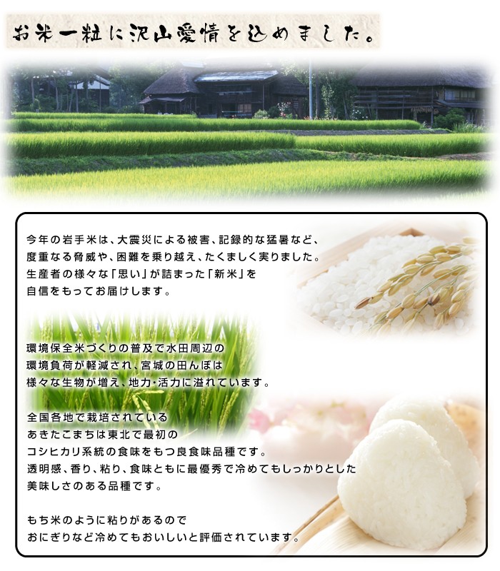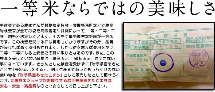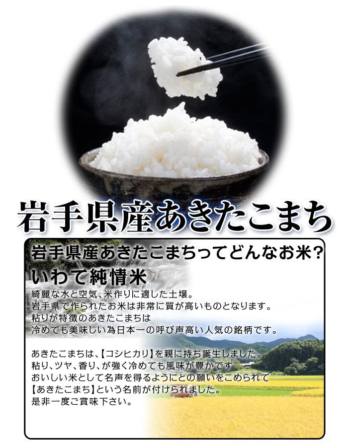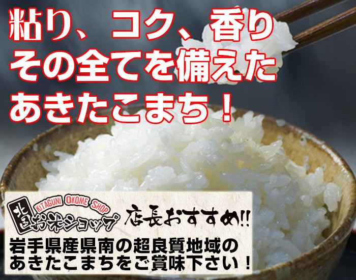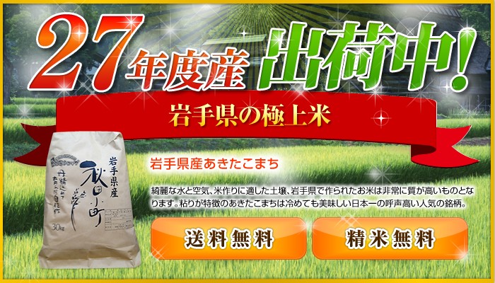 極上一等米あきたこまち!平成27年度岩手県産あきたこまち!あきたこまちならではの「コク・風味・粘り」などの良好なバランス!!北国お米ショップが自信を持ってお送りするあきたこまちを他には真似出来ないこの価格でご提供!是非この機会にお召し上がり下さい。