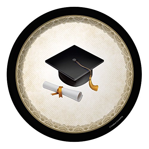 -. Feature : Black and gold paper product bundle includes: 8 dinner plates, 8 dessert plates, & 16 napkins / Dinner plates measure 8 3/4" round / Dessert plates measure 6 7/8" round / Plates & napkins feature a cap and diploma design with words "Congratulations Graduate" / Disposable tableware for your graduation party!