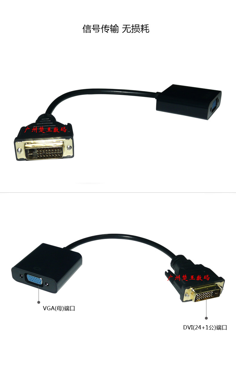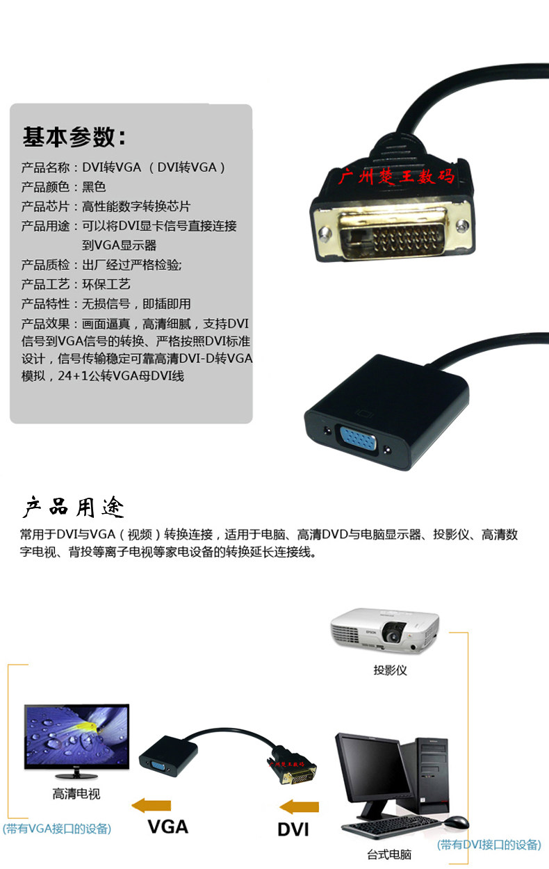 广泛应用于带DVI接口(电脑,DVD,其它高清设备)的信号源连接到带VGA接口的显示设备