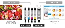 写真あざやか文字もくっきり「5色ハイブリッド」 写真に強い染料インクが豊かな表現力を実現。 また文字に強い顔料ブラックインクは濃度とコントラストが高く、細かな文字もにじみにくいまま、くっきりと描き出す。 |