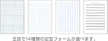 多彩なプリント 仕事や学習に活用できる便利な「定型フォーム印刷」 ビジネスや学習用に活用できる定型のフォーム印刷可能。 レポート用紙、スケジュール用紙、方眼紙、チェックリスト、五線譜、漢字練習帳など、合計14種類をご用意。 また両面印刷もでき、用紙を節約できる。 自分の名刺も、自分でつくれる「名刺サイズ用紙」もプリント可能。 |