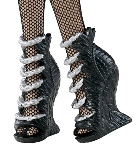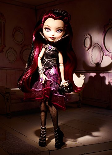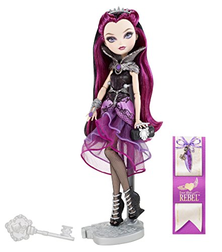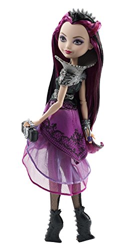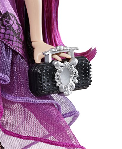 -. Feature : Posable doll wears a purple layered skirt with black bodice and tall, feather-detailed collar / Accessorizes her edgy outfit with silver bangle bracelets, black purse, and open-toe wedge heels / Tops her purple-streaked black hairstyle with a silver spiked headband / Comes with a bookmark with her unique story / Collect all the ever after high dolls in the Rebel and royal assortments (sold separately) / Raven Queen, daughter of the Evil Queen, decides to flip tradition on its crown and chose her own destiny! / Raven doll's black iridescent bodice rises dramatically up to a tall, silvery feather-detailed collar that complements the silver atop her spiked headband / Stacked bangle bracelets with a jewel ring, open-toe wedges and a shimmery black studded clutch purse complete her edgy rebel look / Comes with a doll stand, signature-styled headpiece, detailed jewelry, handbag, pair of spellbinding shoes and doll hairbrush / Get each character's hexclusive story in her story bookmark