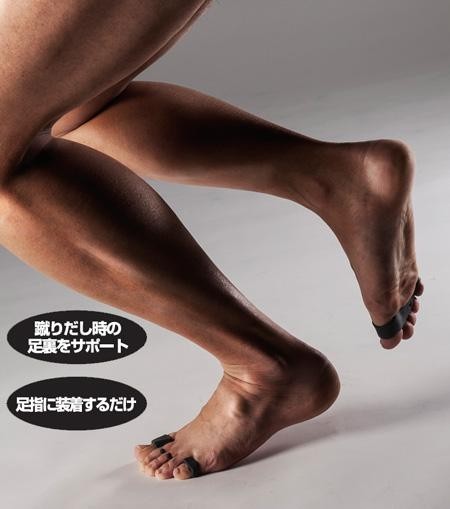 | 足指に装着して「握る、開く」を繰り返すことで、足裏の足底筋群を刺激し。蹴りだしにおける最も重要な足指力をサポート。足裏を使いこなして、ライバルに差を付けろ。 |