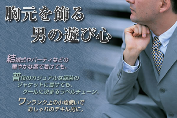 結婚式やパーティなど特別な時はもちろん、普段の服装でもひと味違うクールな男を演出したい方に!胸元を飾るラペルチェーンでおしゃれのデキル男に☆