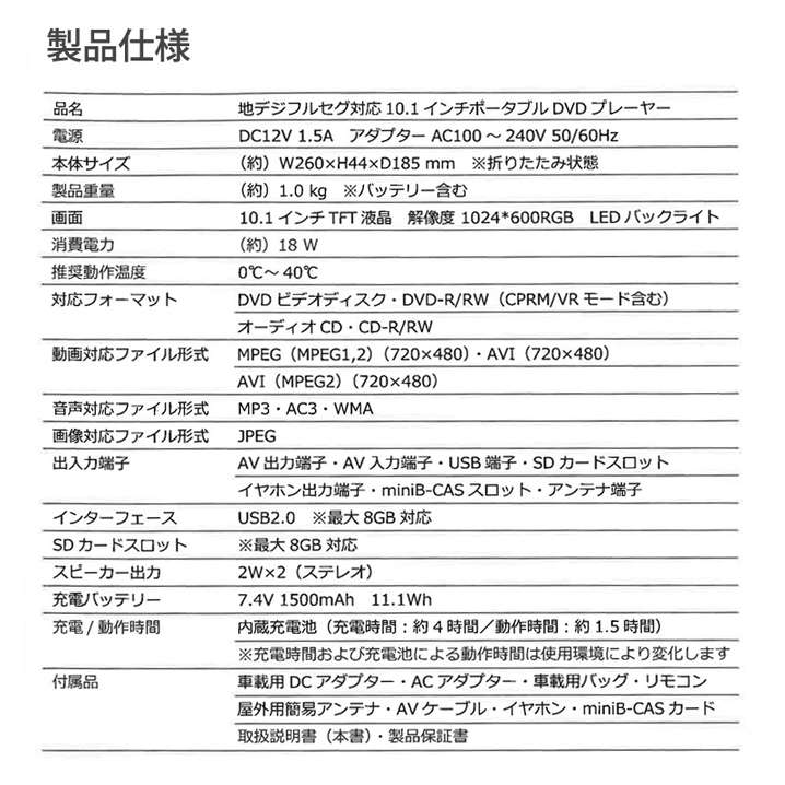 ●付属品:ACアダプター・車載用DCアダプター・車載用バッグ・簡易アンテナ・AVケーブル・リモコン・miniB-Casカード・取扱説明書・保証書