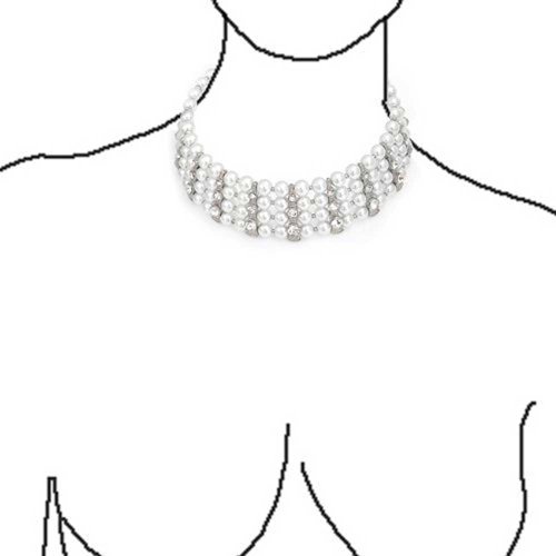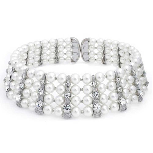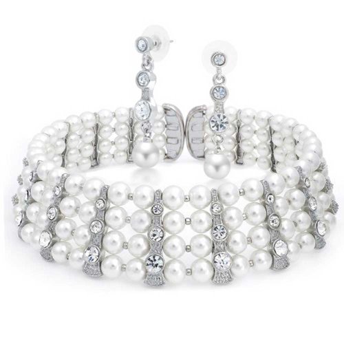 This stunning choker pearl necklace and earrings set is the perfect wedding bridal jewelry accessory for any bride to be or mother of the bride to be. Boasting four rows of white simulated pearls, this stunning white pearl choker necklace set can be accompanied by the matching pearl drop earrings, as the two bridal jewelry pieces are sold as a necklace and drop earrings jewelry set. This gorgeous pearl jewelry set is a great Mothers Day gift for any mom with a June birthday.