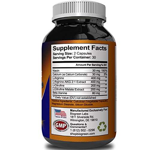 It's not always possible to reach adequate L-arginine levels, especially if there's an underlying medical condition present. Taking a supplement is the only way to ensure that you're providing your body with all it needs. Through its ability to dilate the blood vessels, this amino acid has the effect of lowering blood pressure and supporting a healthy cardiovascular system. Taking L-arginine also helps your body create urea, remove excess nitrogen and regulate waste and chemical imbalances. In addition to this, supplementing with L-arginine is believed to be beneficial to bodybuilders due to its ability to synthesize proteins and increase muscle mass. This also leads to increased strength and energy. For the best quality and most potent L-arginine available, Biogreen Labs offers you 800mg in each capsule and other amino acids for maximum effectiveness and absorption. Our all natural formula comes with a 60-day money back guarantee for your ultimate satisfaction.Feature