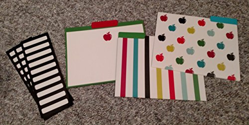 -. Feature : Top tabs for easy labeling (tri-cut staggered) / 9 count package (3 of each design) / Features: Stripes, Multi-color apples, and single apple / Labels included / Measures 9" x 11.5" Letter-sized