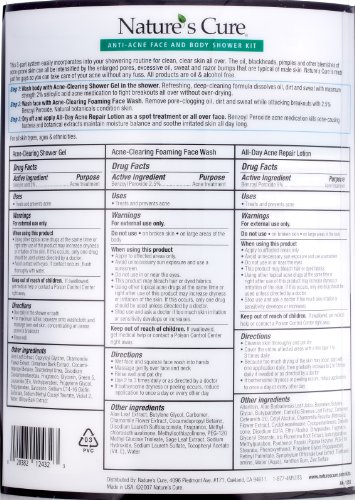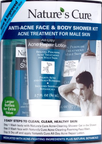 ReleaseDate : 2013-09-01 Studio : Nature's Cure Publisher : Nature's Cure Binding : Health and Beauty Product Description For you, convenience is everything. And with larger pores, razor bumps and more sweat, you need an acne kit that will fight acne all over. The acne kit for you is the 3-step Nature's Cure anti-acne face and body shower kit. This acne kit includes a medicated shower gel, face wash and acne repair lotion. Each product in the Nature's Cure acne kit for guys uses strong medicines, like benzoyl peroxide and salicylic acid, that are tough on acne, coupled with natural botanicals that are gentle on skin. Eliminate?breakouts effortlessly?by incorporating this acne kit into your daily showering routine. This 3-part system incorporates into your showering routine for clean, clear skin, made just for guys so you can take care of your acne without any fuss. Medicated with acne-fighting ingredients plus natural botanicals. Products are oil and alcohol free. 0